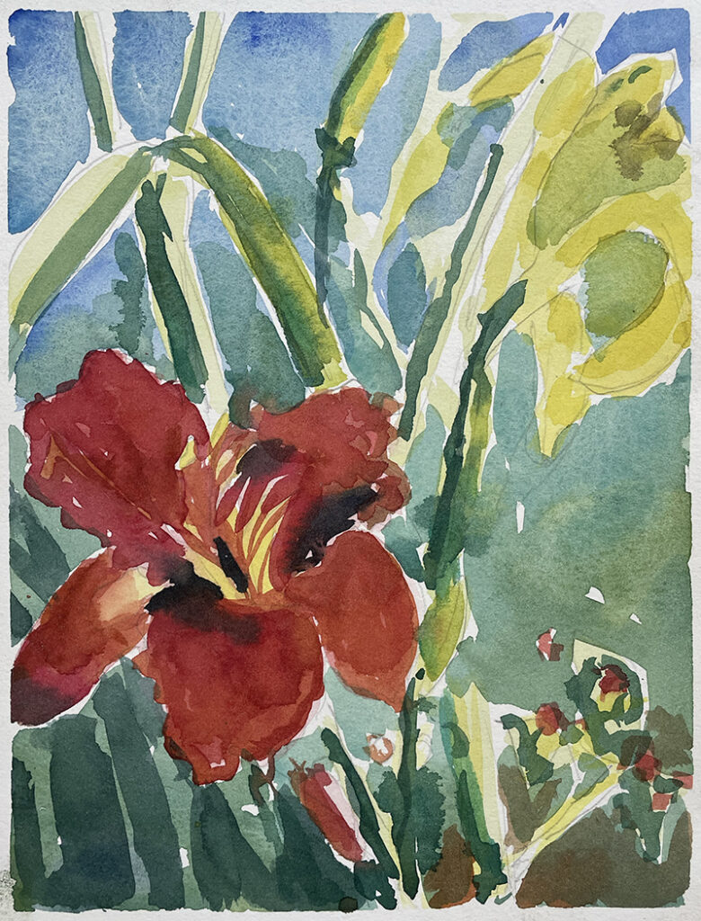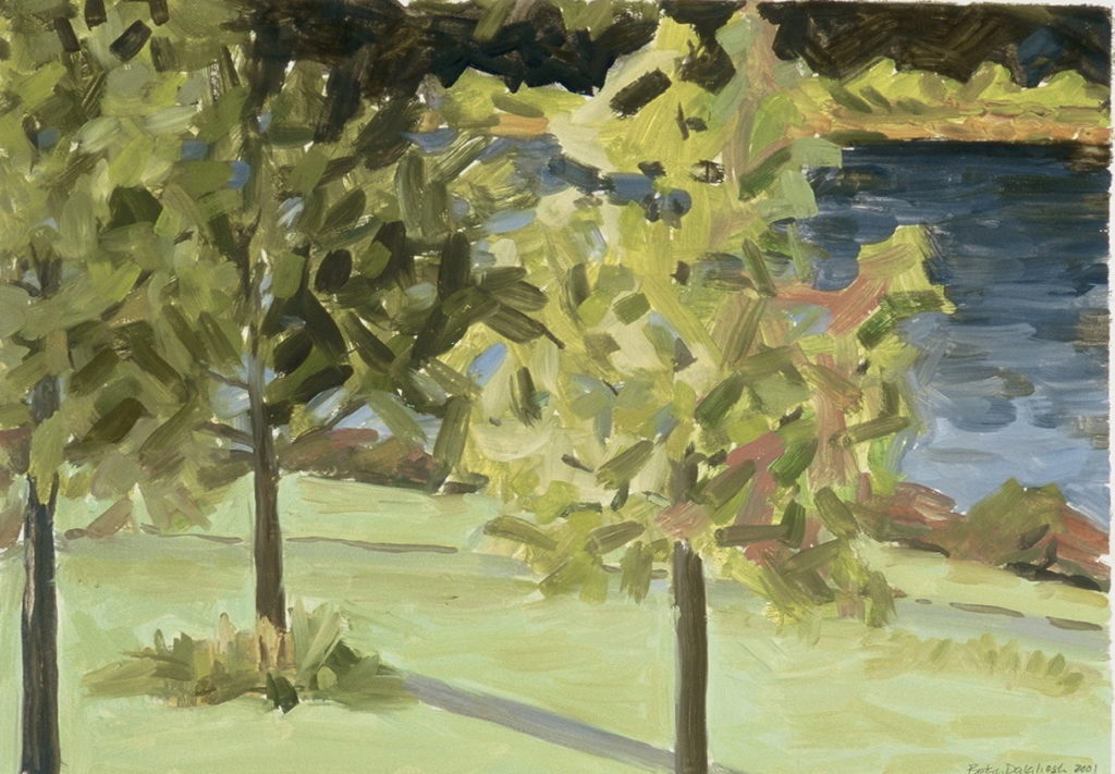 Trees and Blue Lake, Oil on paper, 10 x 15 inches